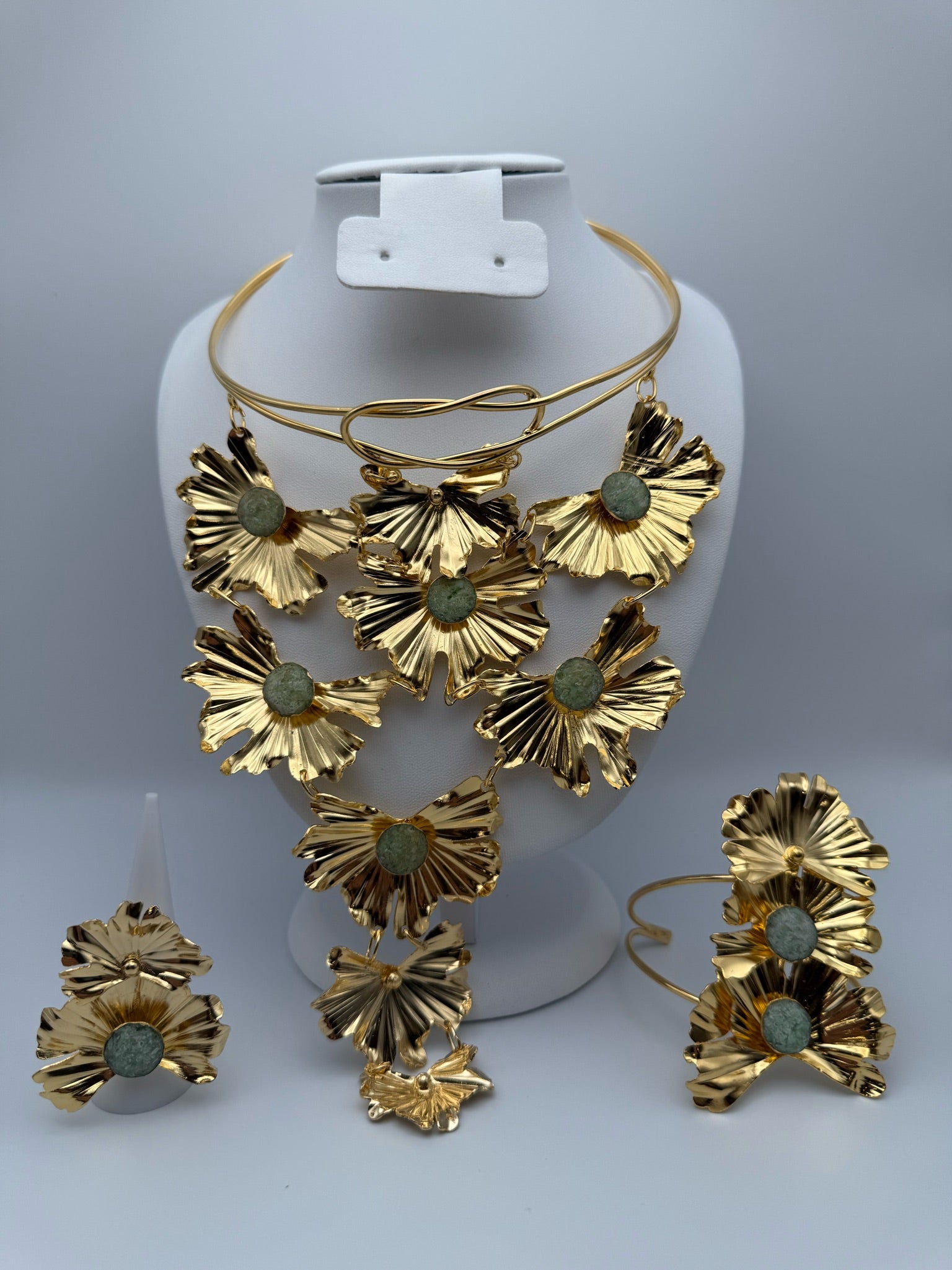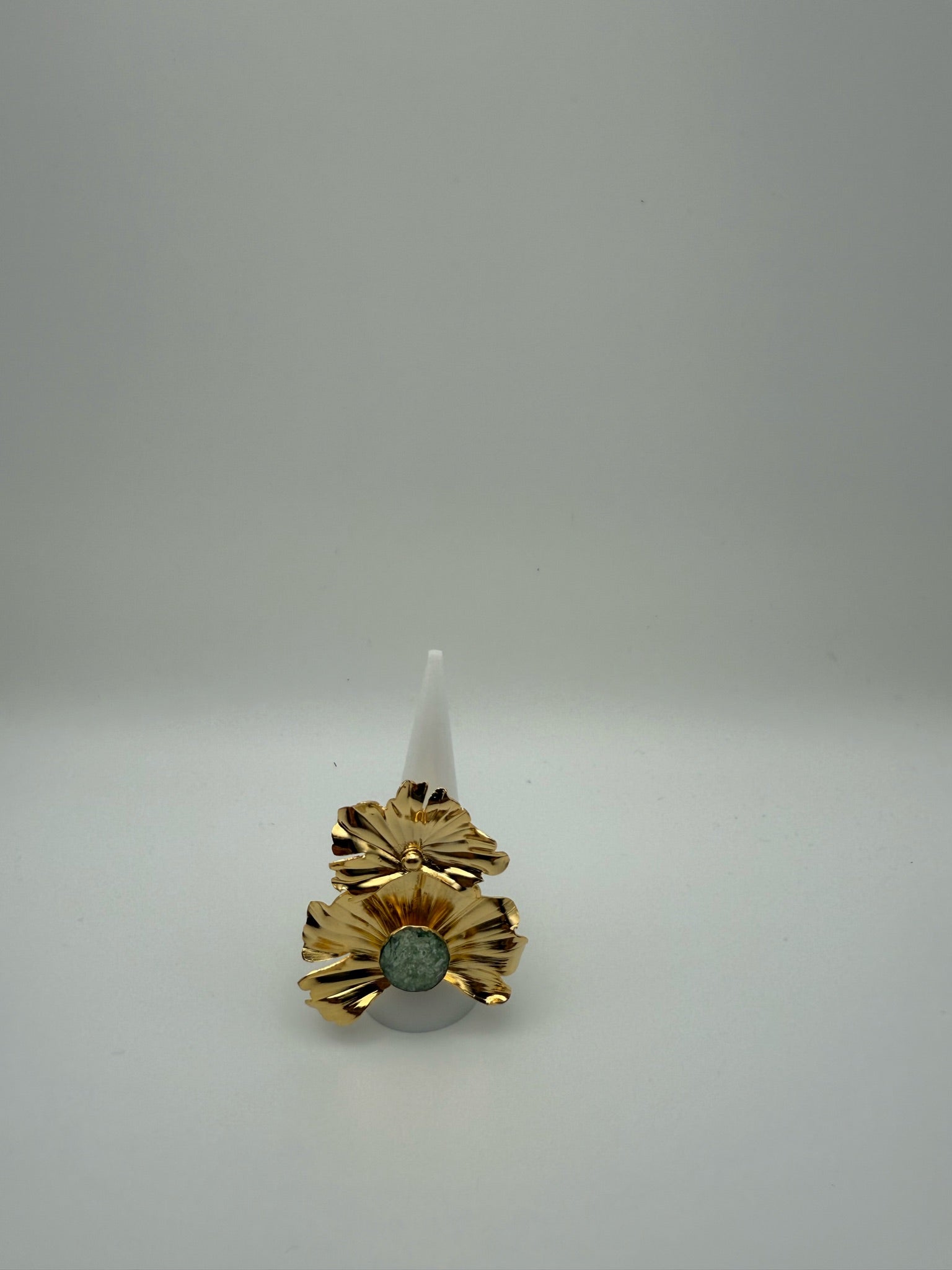 Esta pieza es elaborada 100% a mano y tiene un baño de 24k está en forma de una flor con un cristal verde