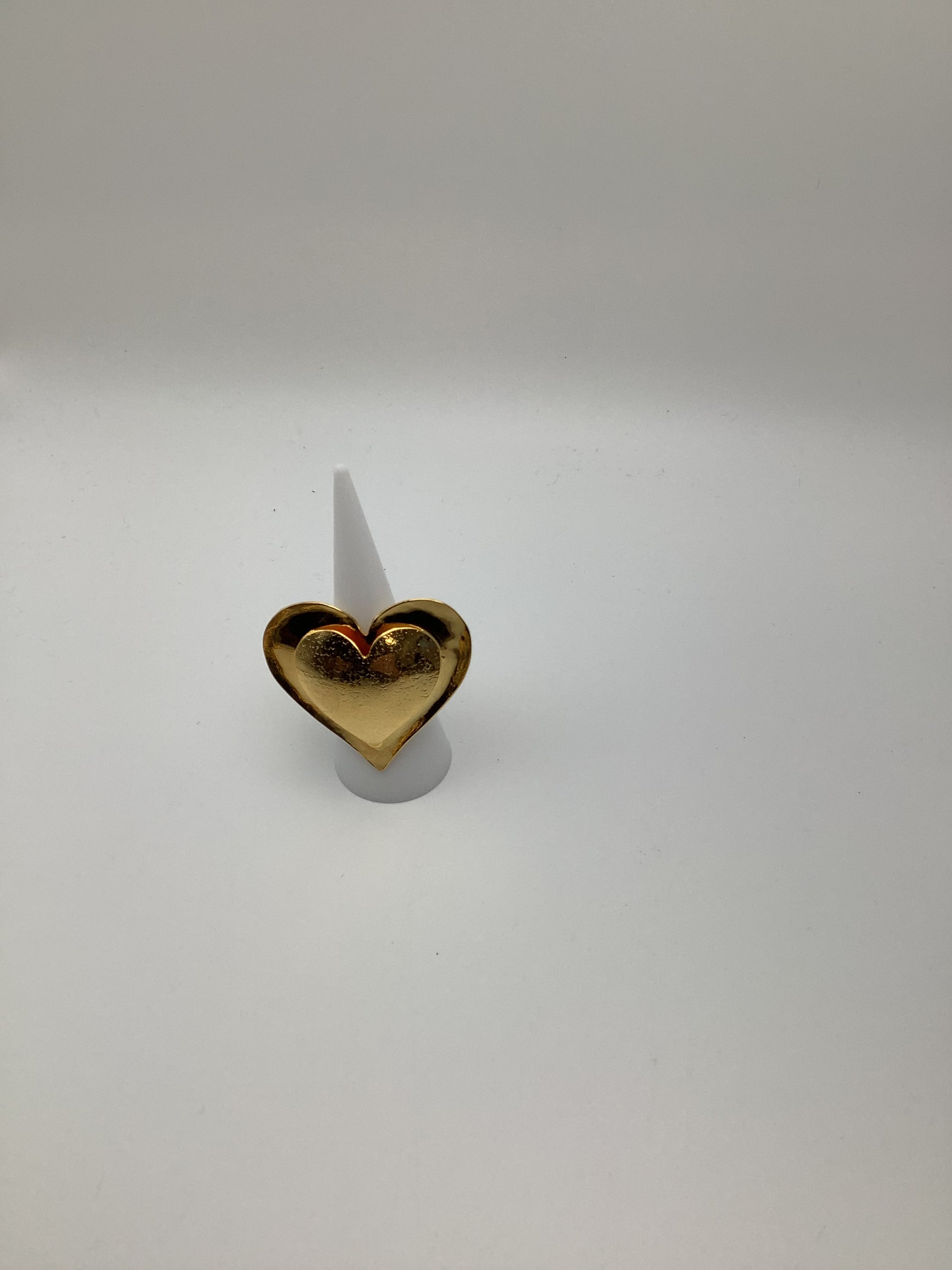 Esta pieza es elaborada 100% a mano y tiene un baño de 24k está en forma de un corazón en sima de otro