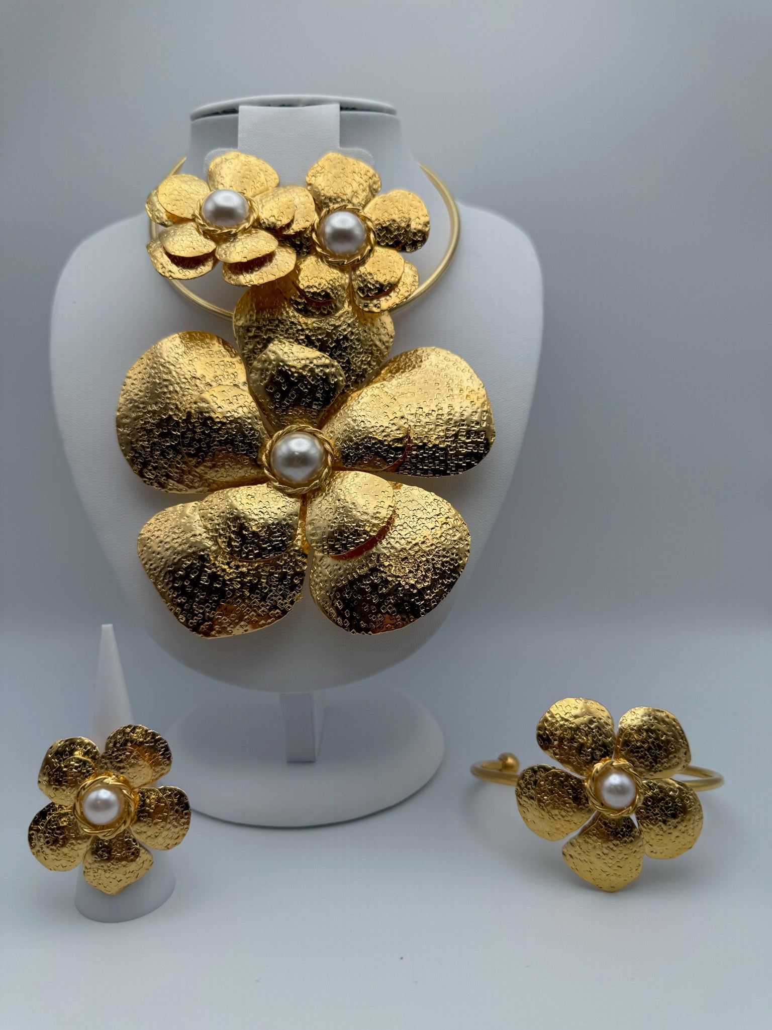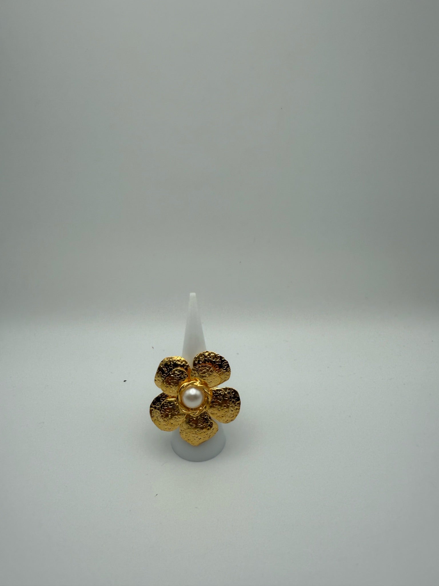 Esta pieza es elaborada 100% a mano y tiene un baño de 24k está en forma de una flor, tiene textura y una perla en medio