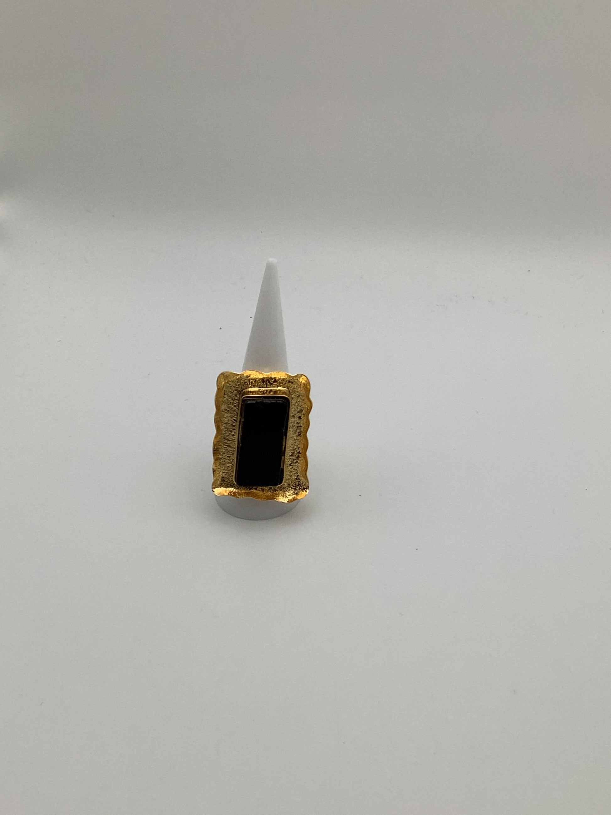 Esta pieza es elaborada 100% a mano y tiene un baño de 24k está en forma cuadrada con un cristal negro en medio