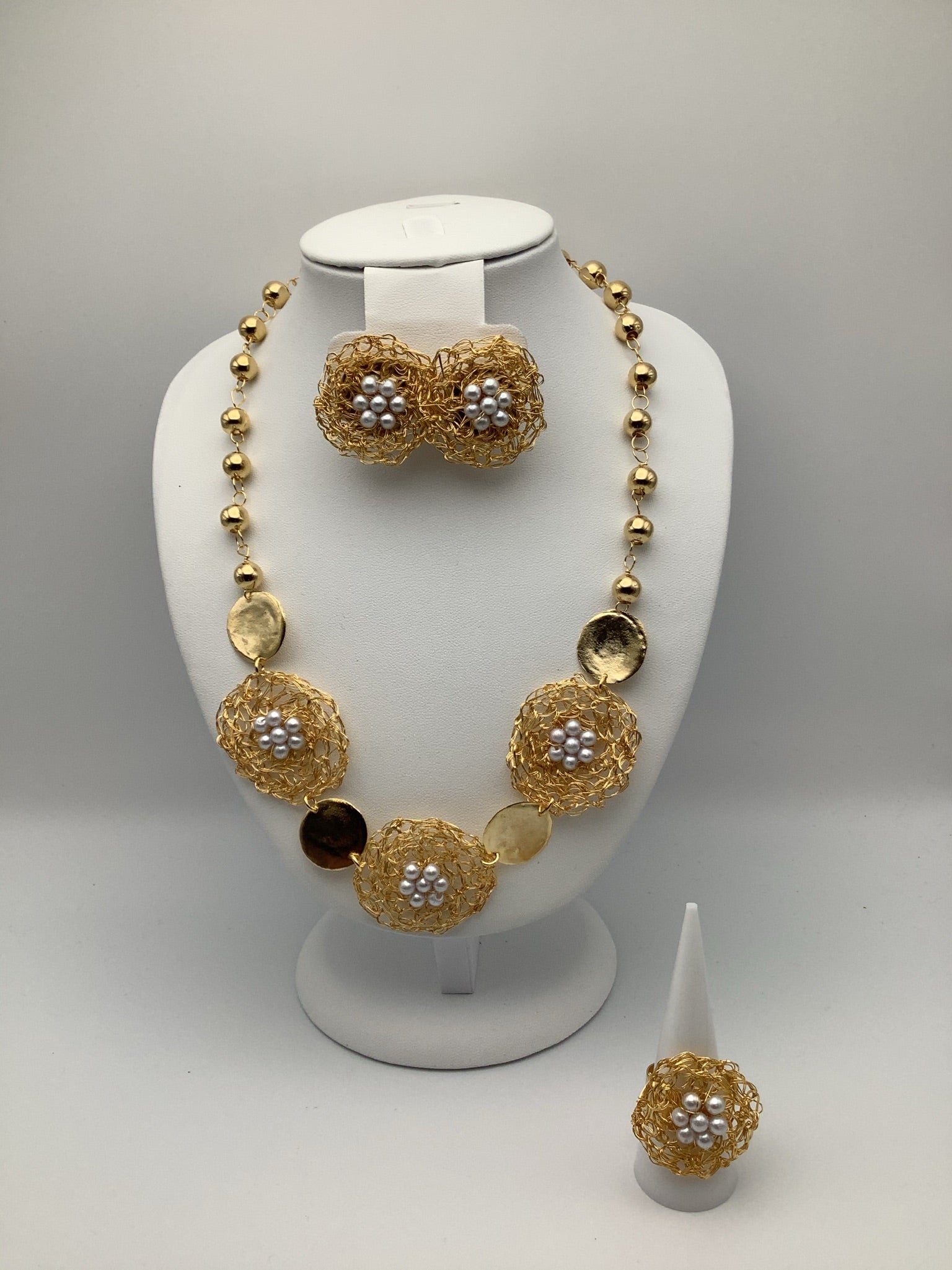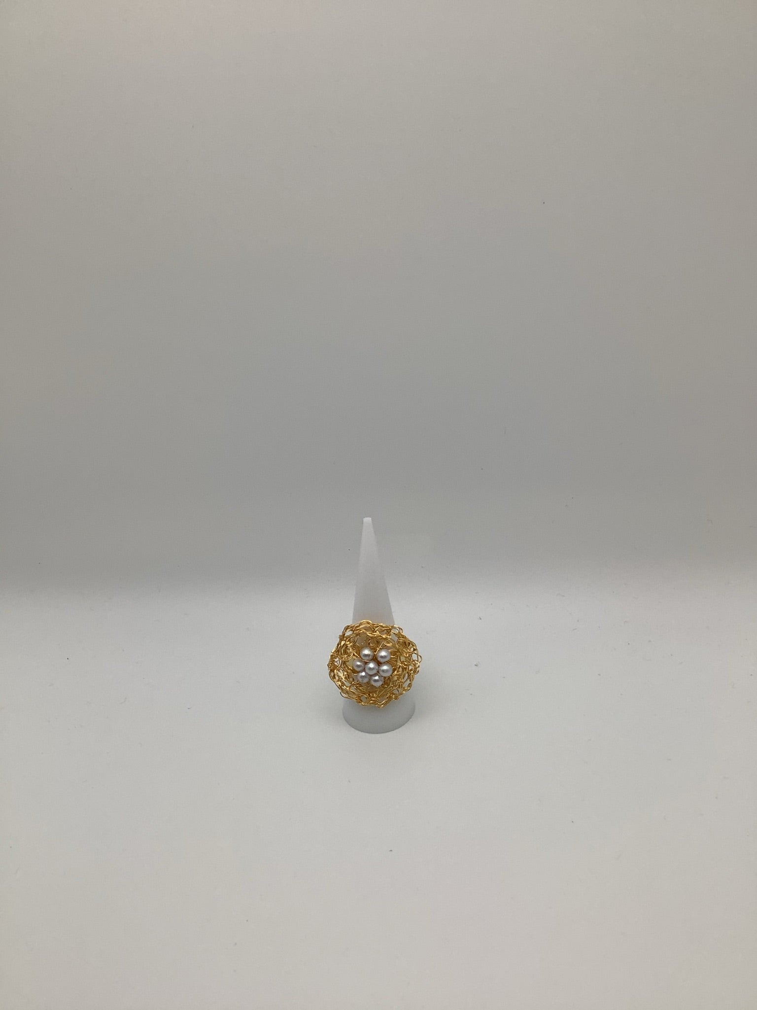 Esta pieza es elaborada 100% a mano y tiene un baño de 24k está en forma de un círculo, tiene textura y varias perlas en medio