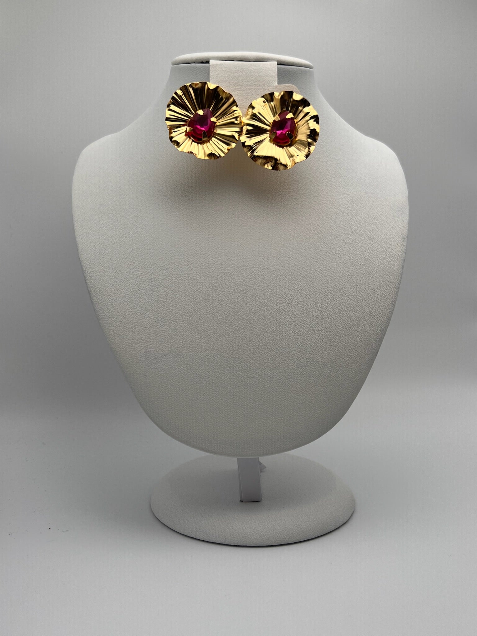 Esta pieza es elaborada 100% a mano y tiene un baño de 24k está en forma de una flor y tiene un cristal fuchsia en medio