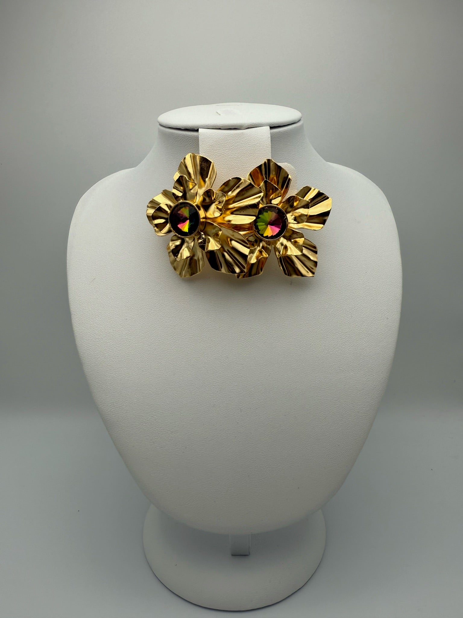 Esta pieza es elaborada 100% a mano y tiene un baño de 24k está en forma de una flor con un cristal