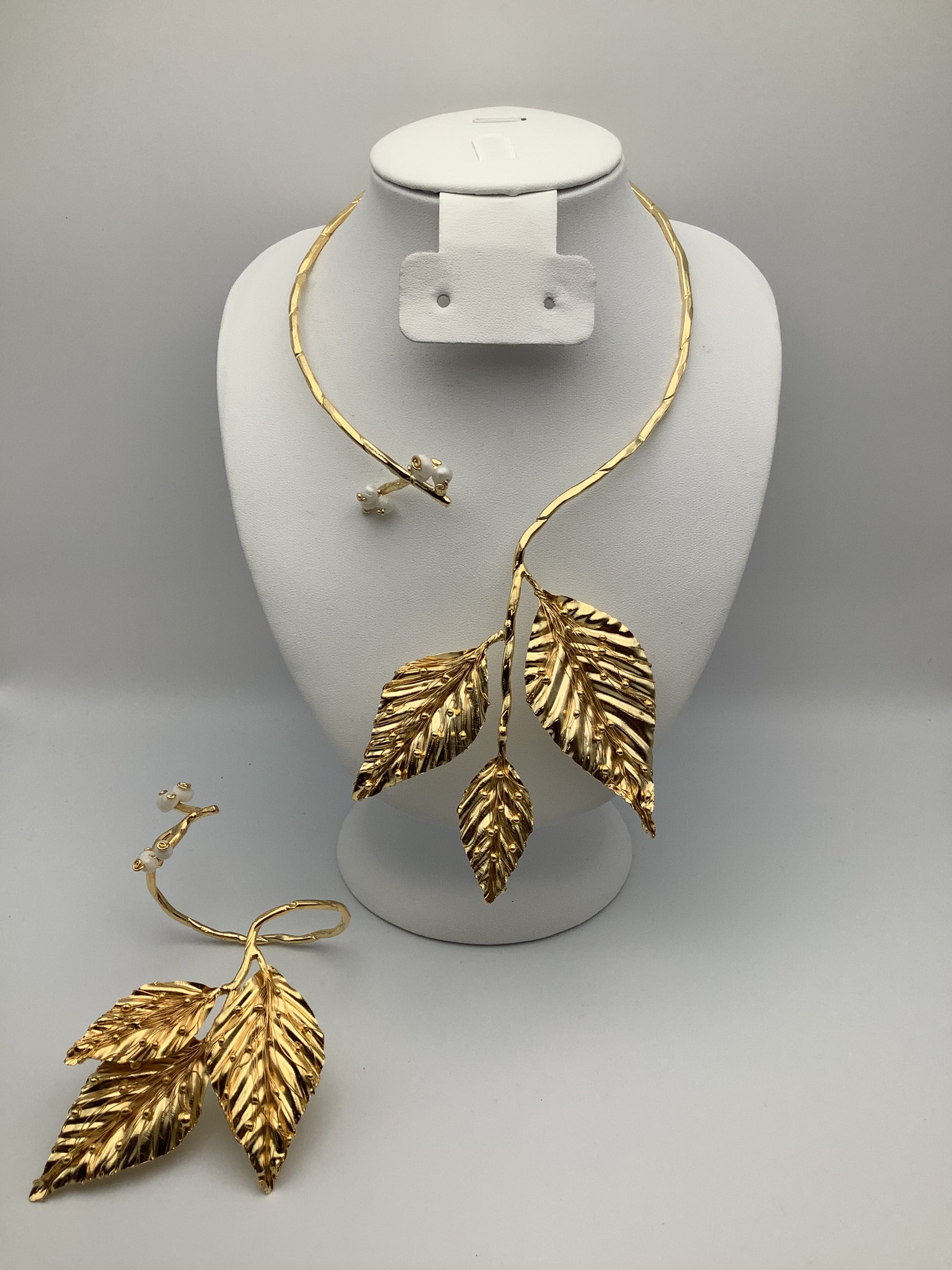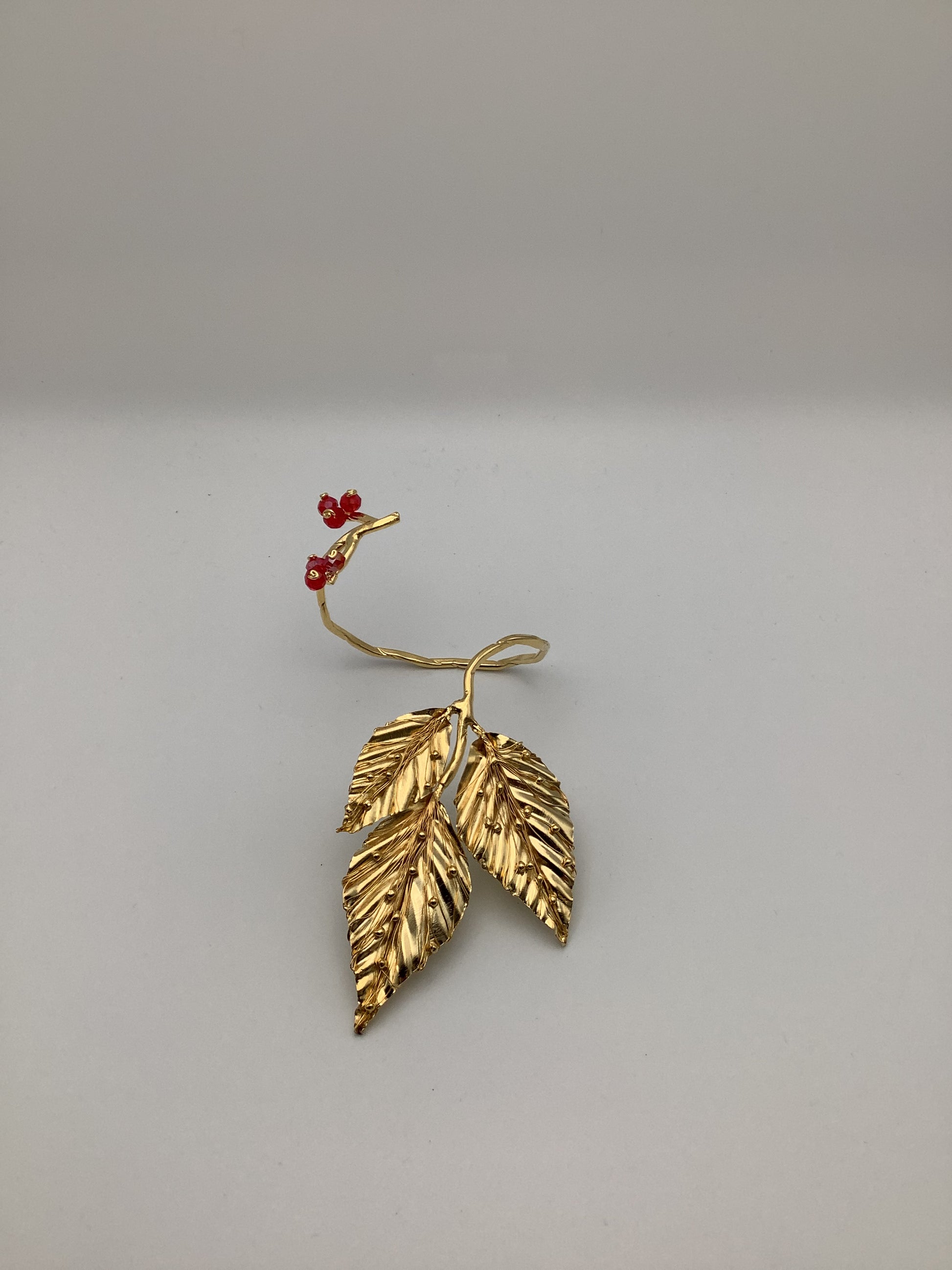 Esta pieza es elaborada 100% a mano y tiene un baño de 24k está en forma de una hoja con detalles