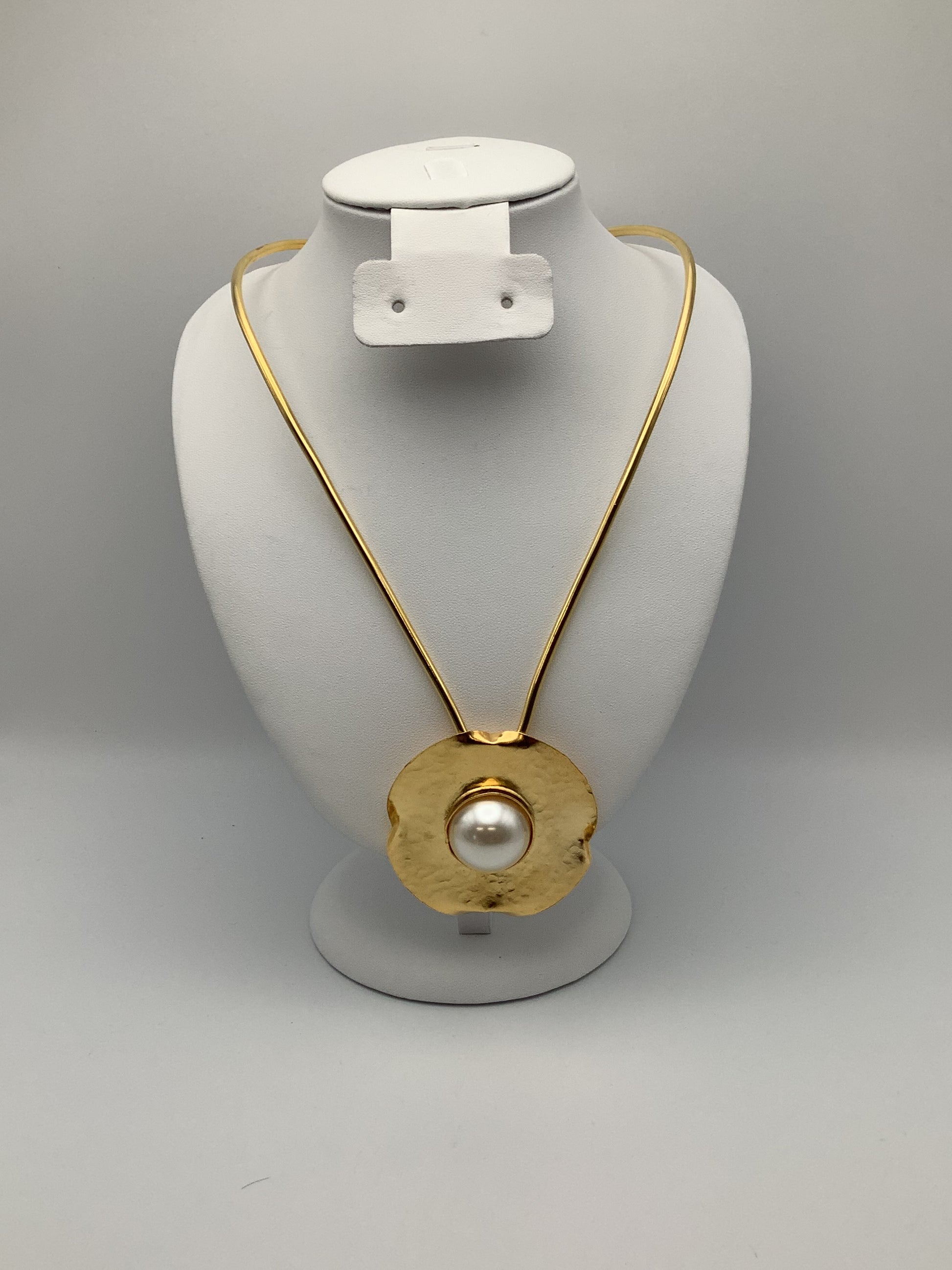 Esta pieza es elaborada 100% a mano y tiene un baño de 24k está en forma de un círculo y tiene una perla en medio