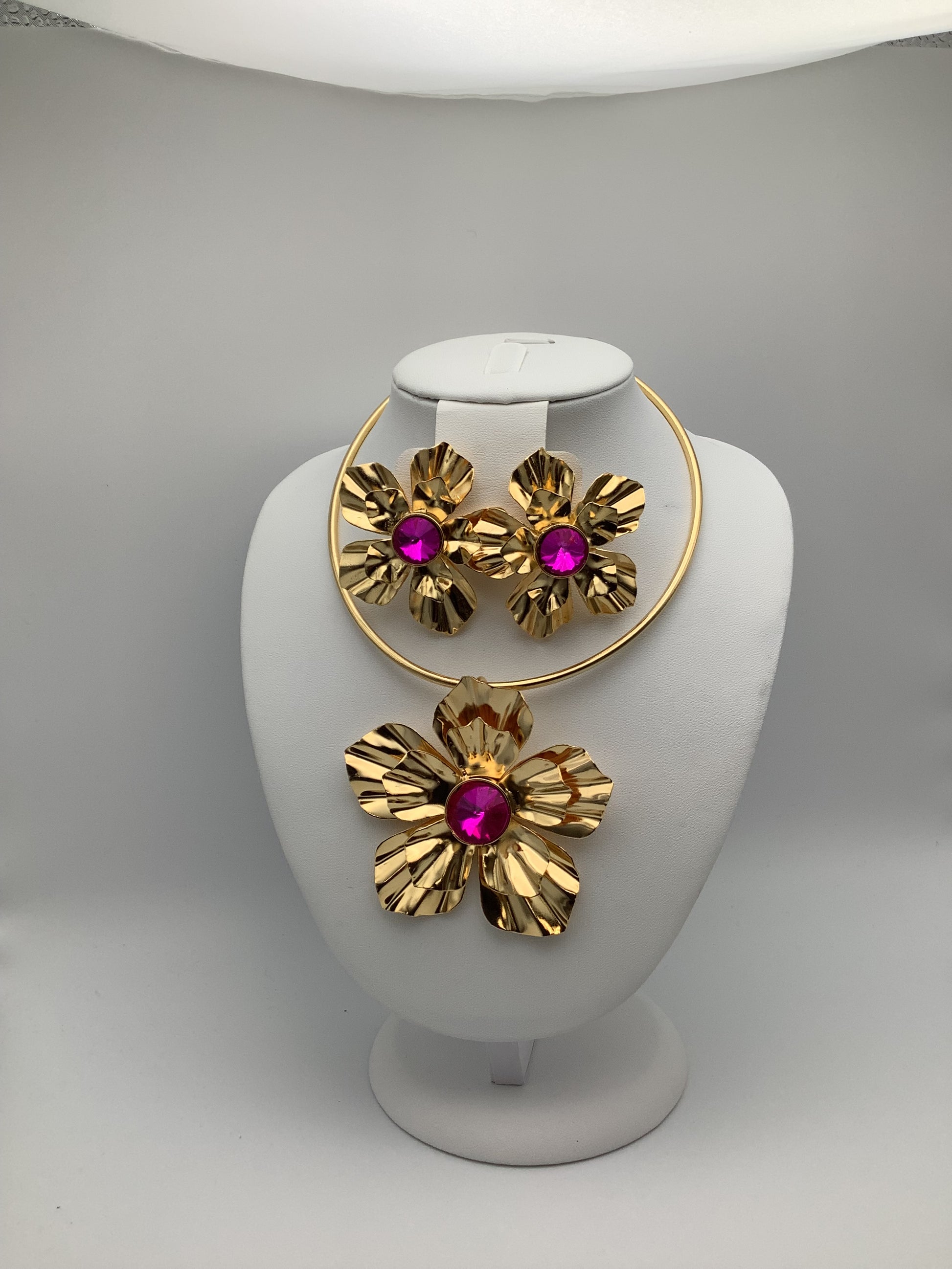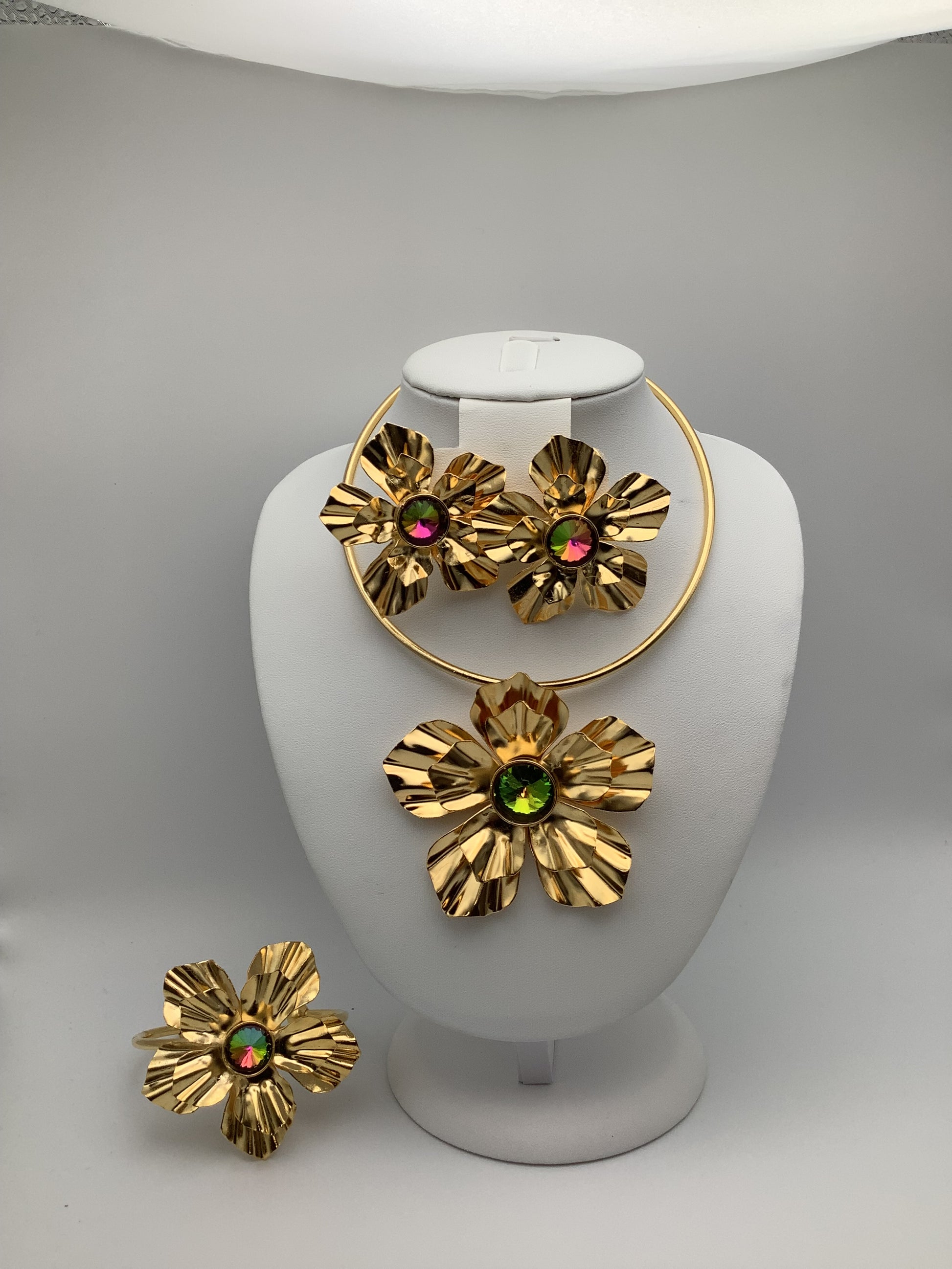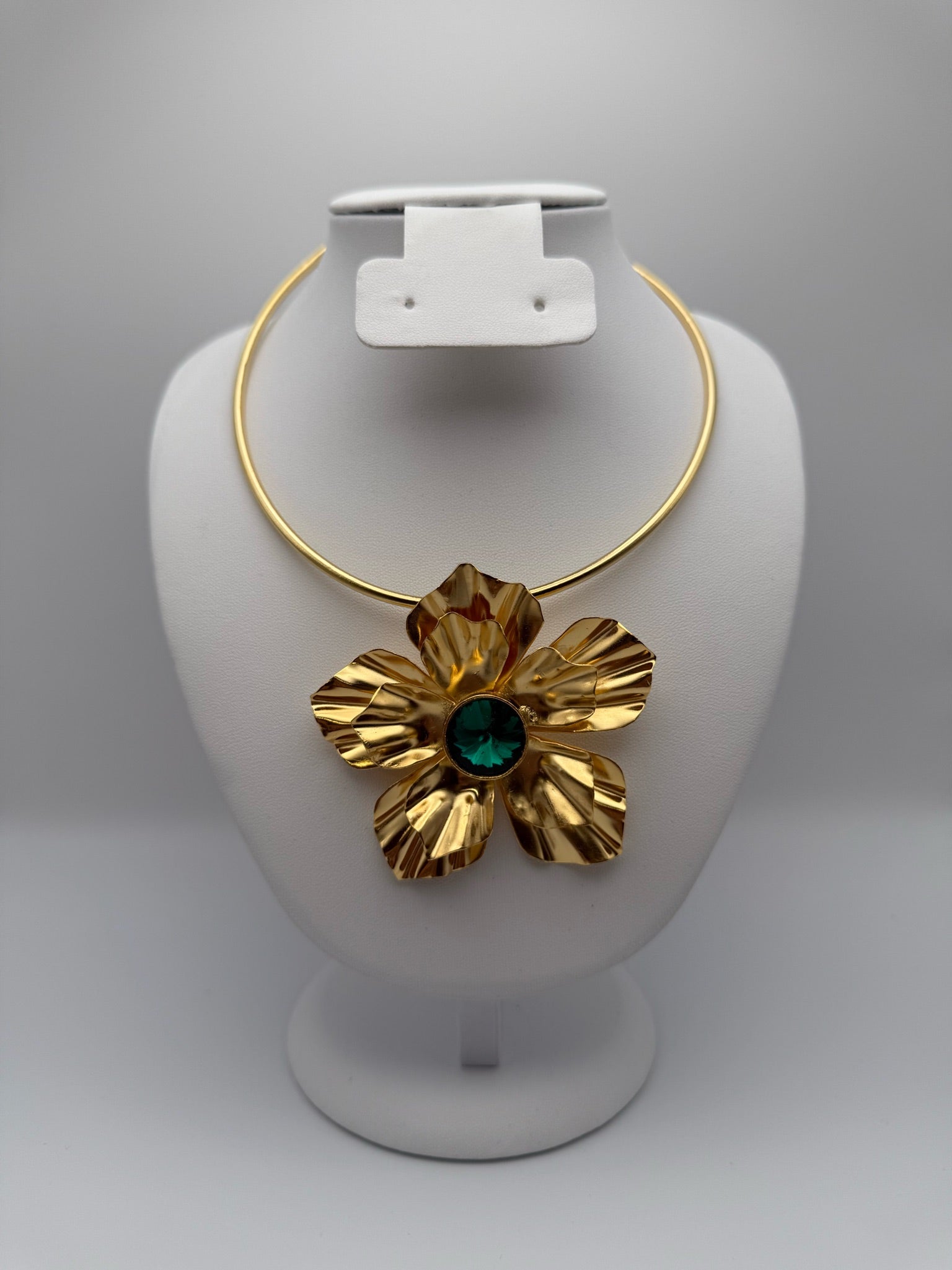 Esta pieza es elaborada 100% a mano y tiene un baño de 24k está en forma de una flor y tiene un cristal en medio