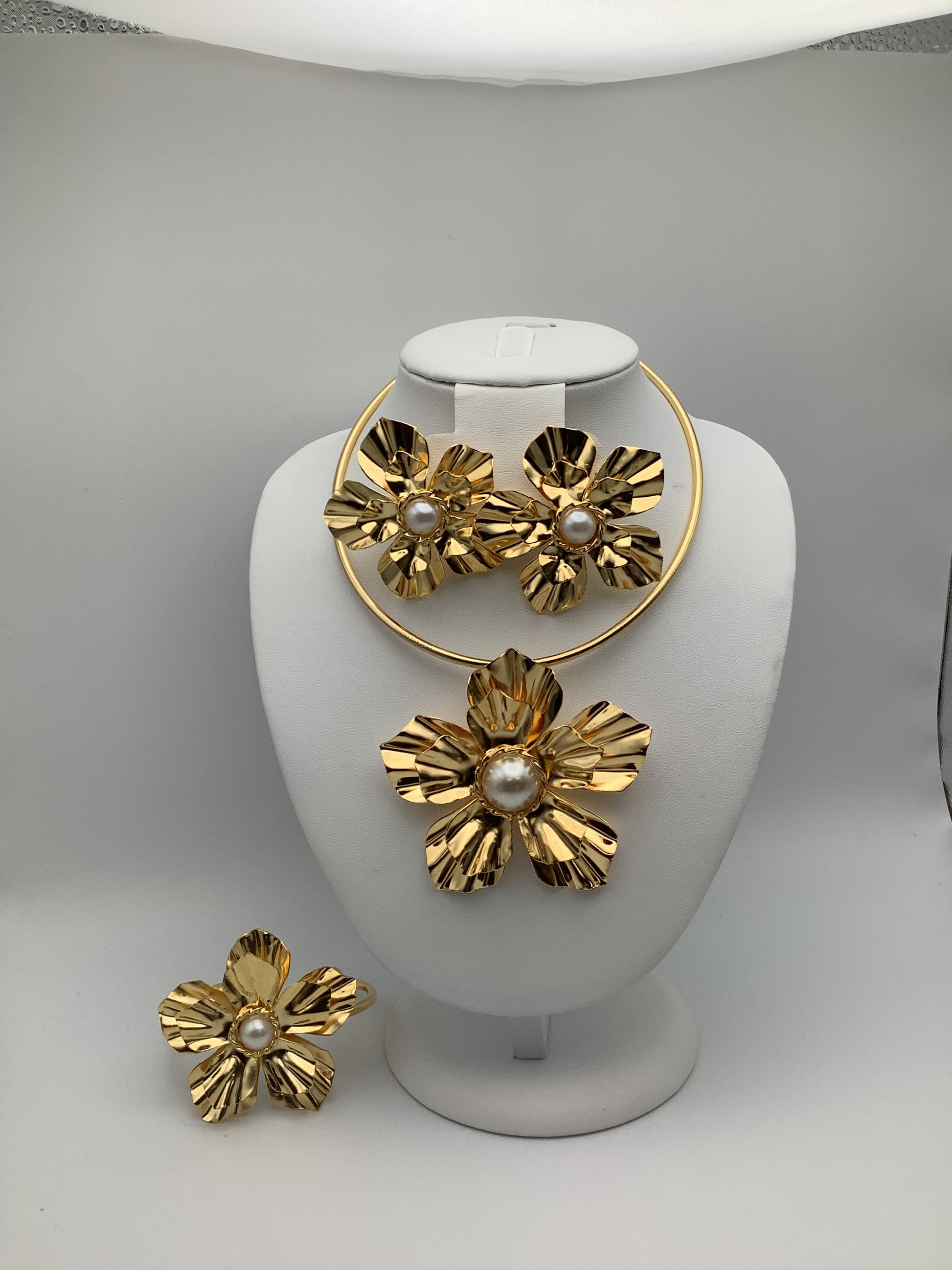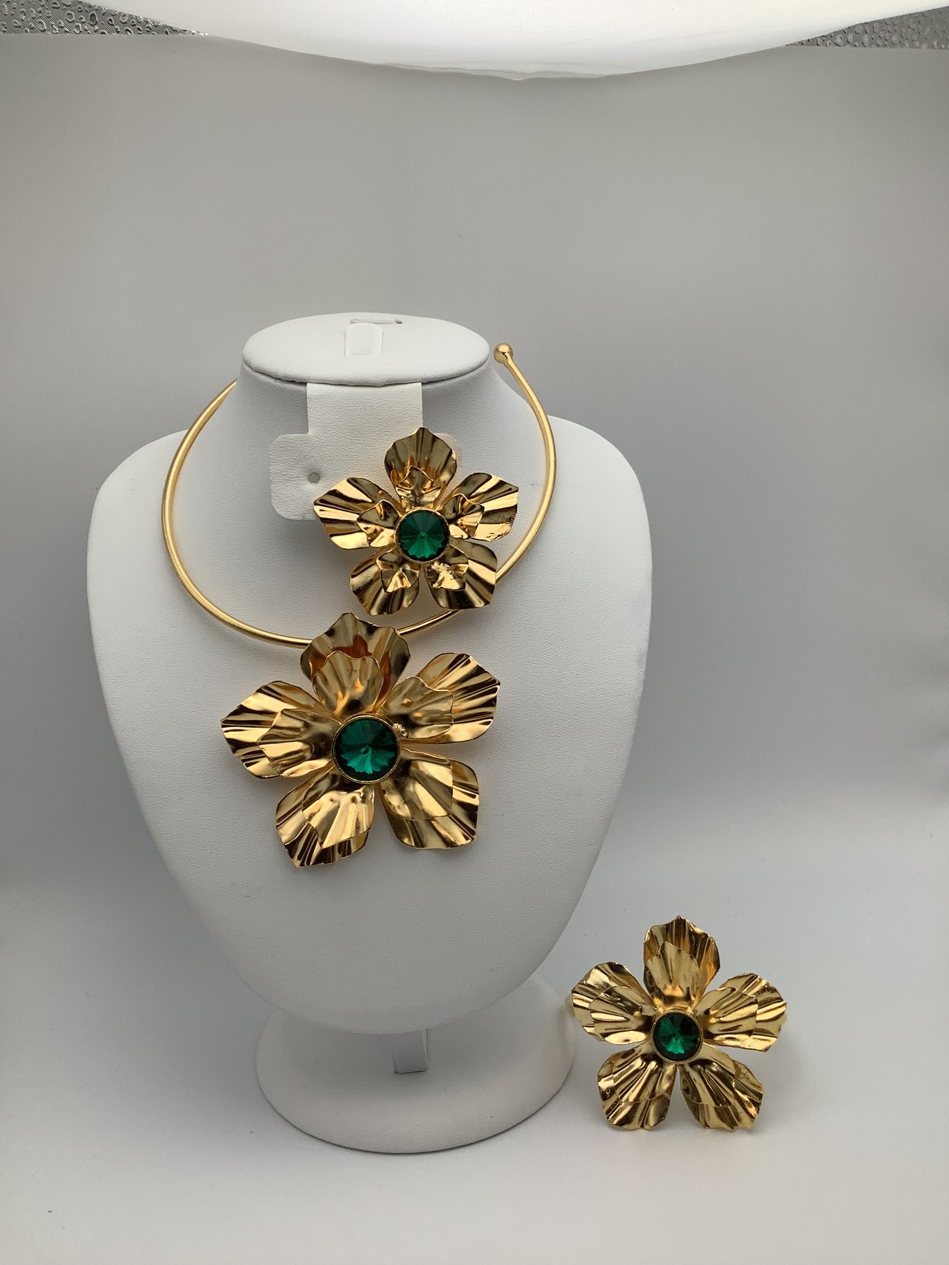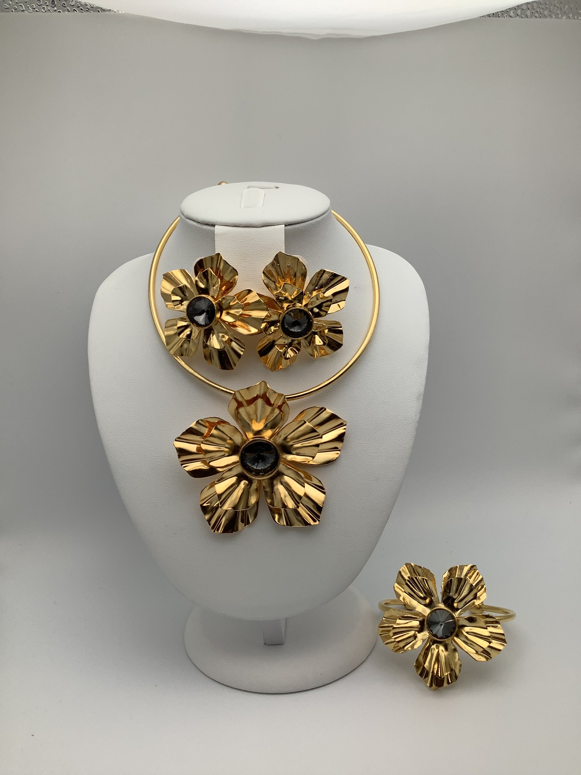 Esta pieza es elaborada 100% a mano y tiene un baño de 24k está en forma de una flor y tiene un cristal en medio