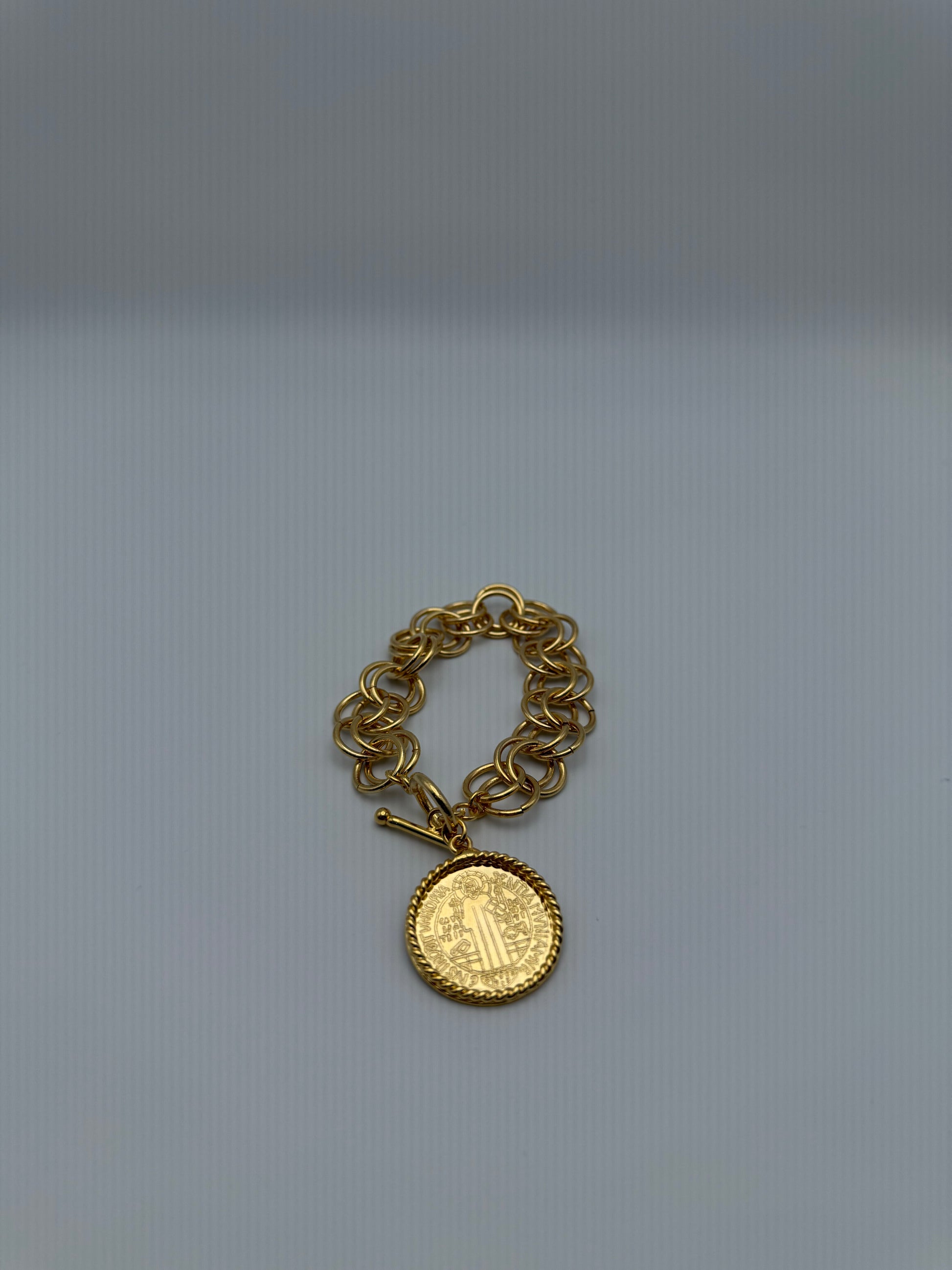 Esta pieza es elaborada 100% a mano y tiene un baño de 24k esta en forma circular y tiene la figura de San Benito