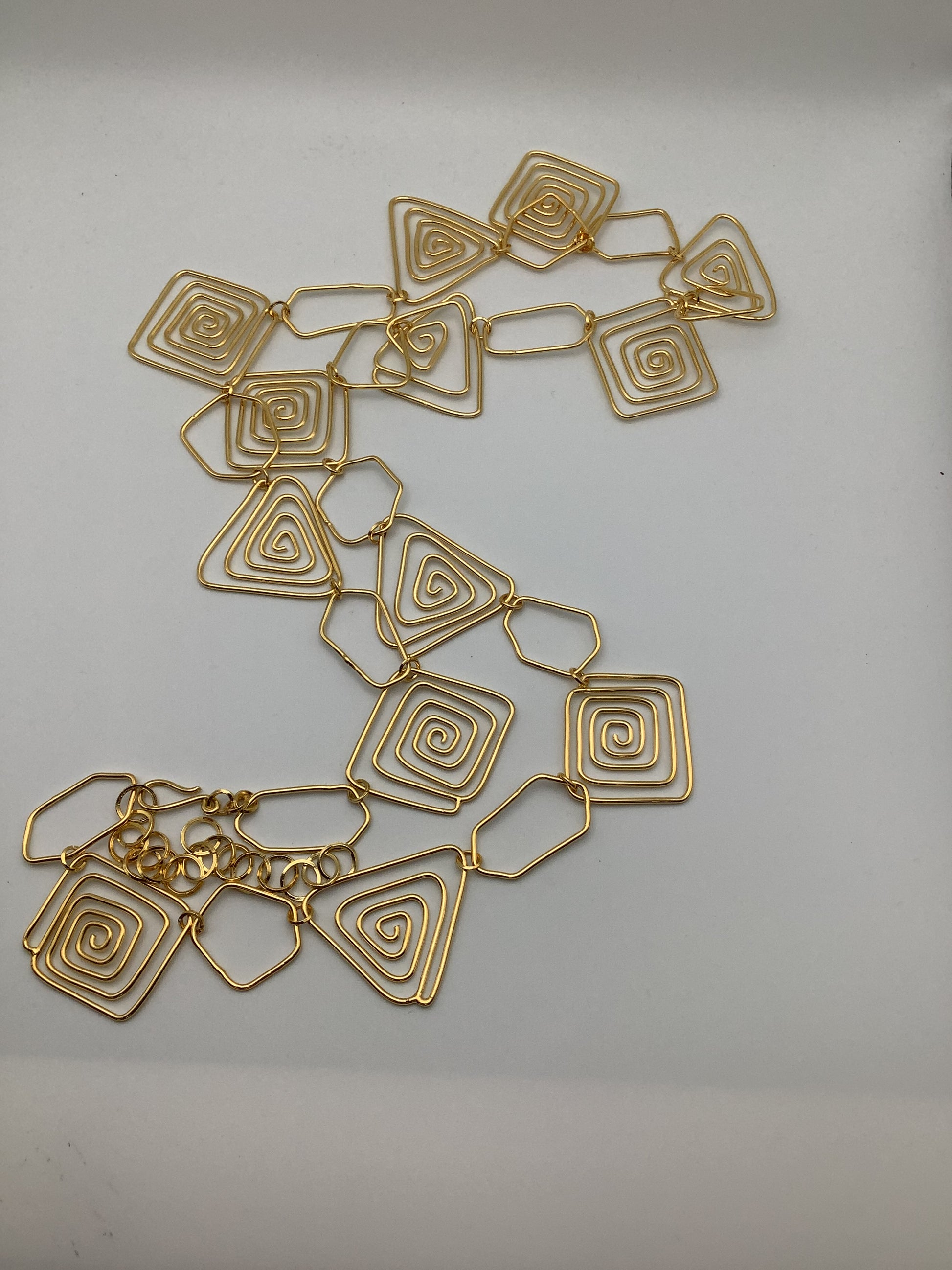 Esta pieza es elaborada 100% a mano y tiene un baño de 24k y está en un forma de cuadrados en espiral