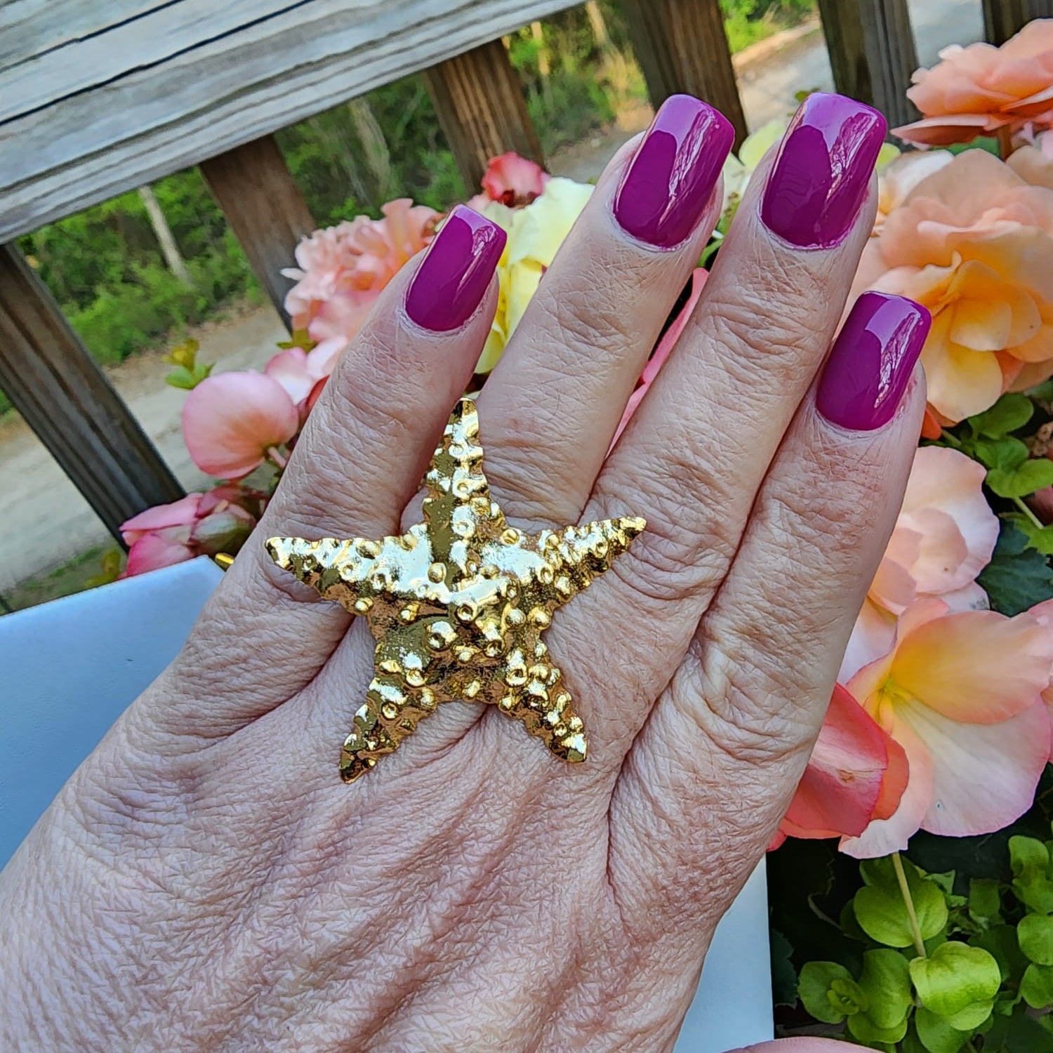 This dazzling ring features a textured starfish design in a high-shine gold tone, perfect for ocean lovers and bold style queens. Adjustable fit for all-day comfort and maximum impact.