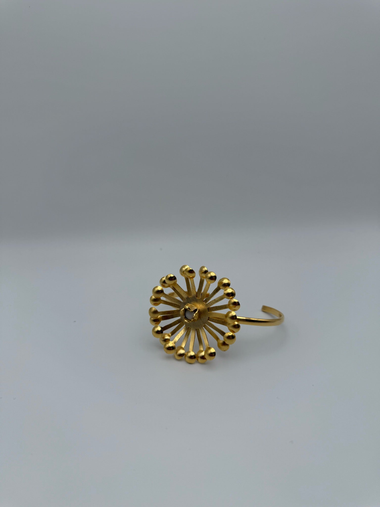 Esta pieza es elaborada 100% a mano y tiene un baño de 24k está en forma de una flor con un cristal en medio y puntos en los pétalos