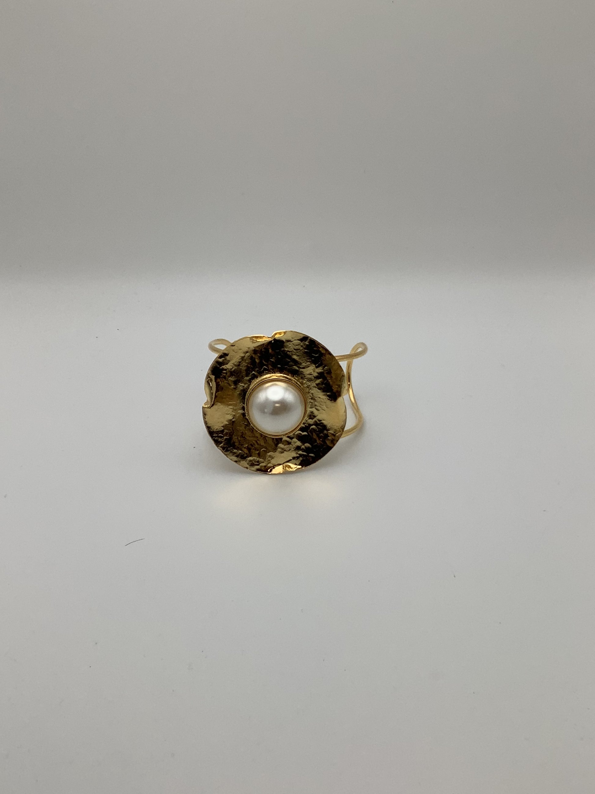 Esta pieza es elaborada 100% a mano y tiene un baño de 24k está en forma de un círculo y tiene una perla en medio